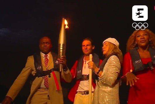 Le flamme est portée vers le Louvre par des athlètes de légende : Karl Lewis, Rafaël Nadal, Nadia Comaneci et Serena Williams (vidéo Eurosports)
